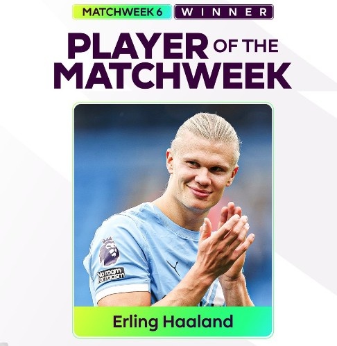 10月1日讯 英超官方公布职业联赛 第六轮最佳球员,曼城五号位哈兰德当选。