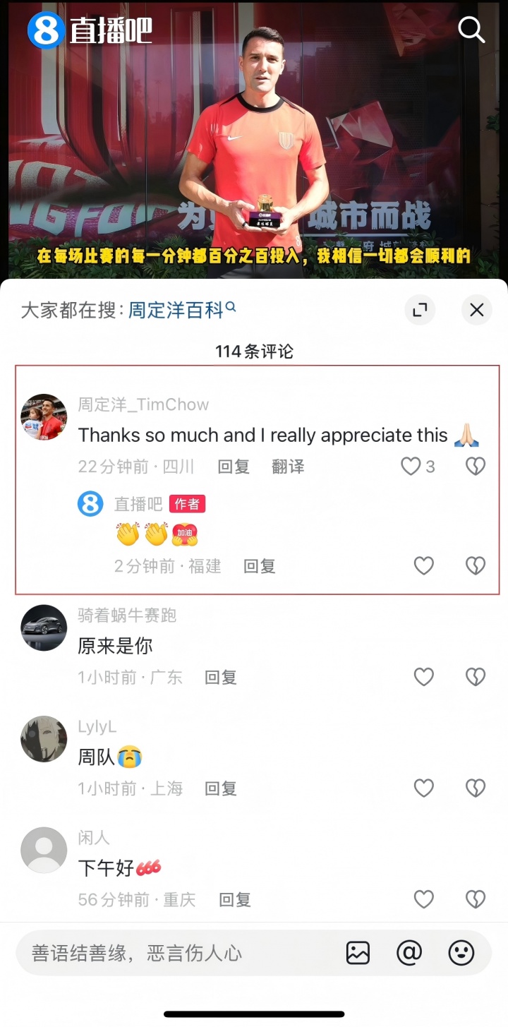 10月17日讯 成都蓉城领队 周定洋当选中超第25轮最佳,小吧本次颁奖特地制作了他喜欢的漫画人物海报,24直播网作为礼物送给他。周定洋也通过社媒感谢和吧友们的支持,他评论道:非常感谢!