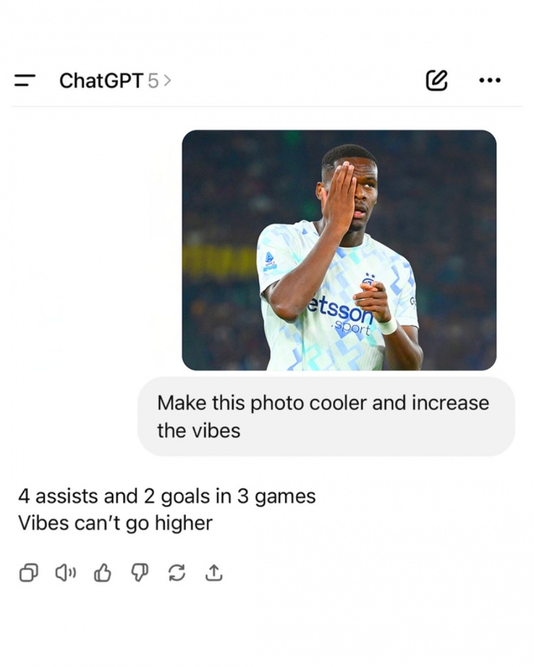 赛后国米官推晒出用ChatGPT整活的照片,他们将博尼庆祝的照片发给AI要其修图,24直播网并注明要把图片变得更酷,氛围感拉起来,AI答复道:“3场赛事 2球4助功 ,没法更嗨了。”