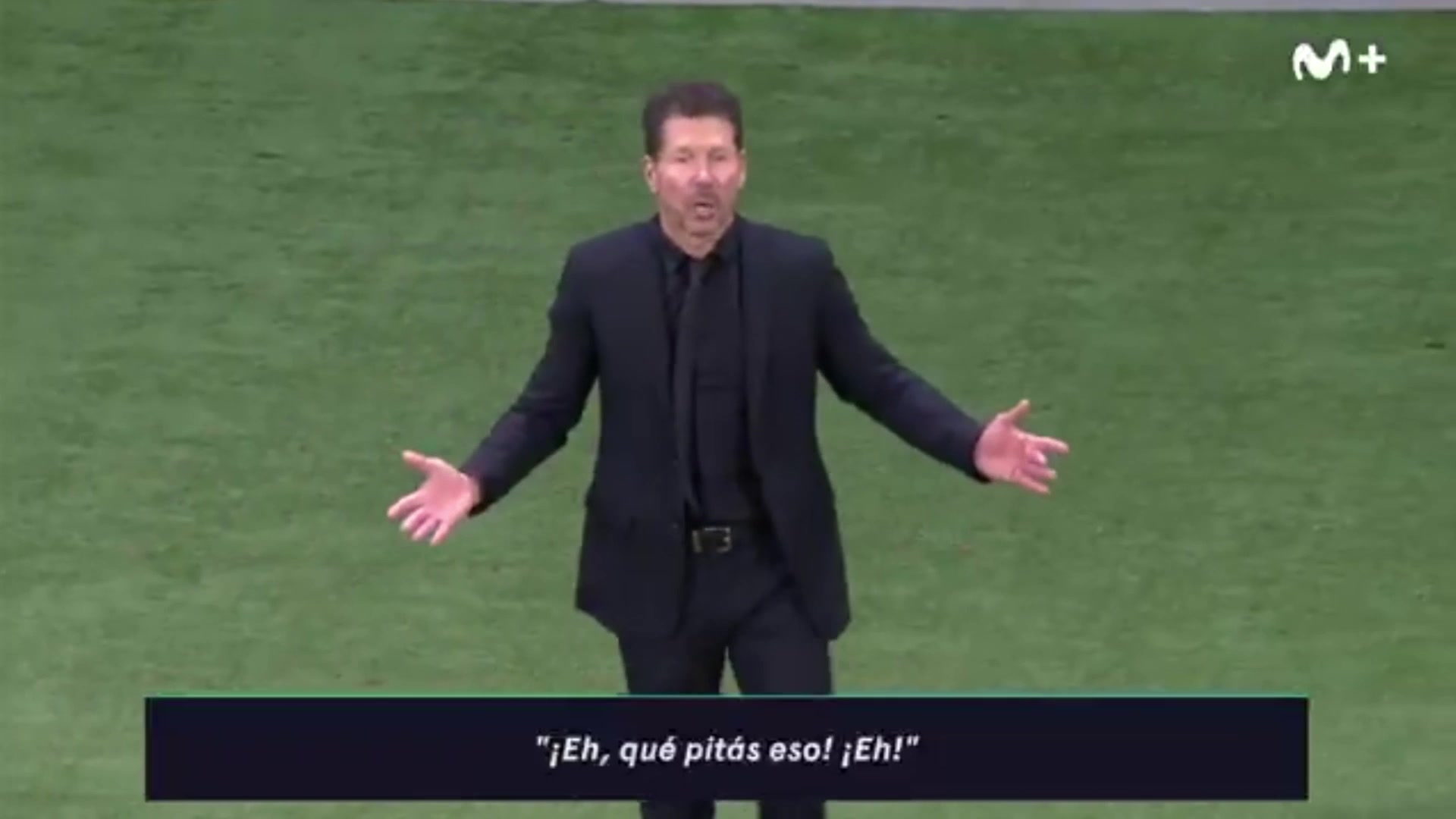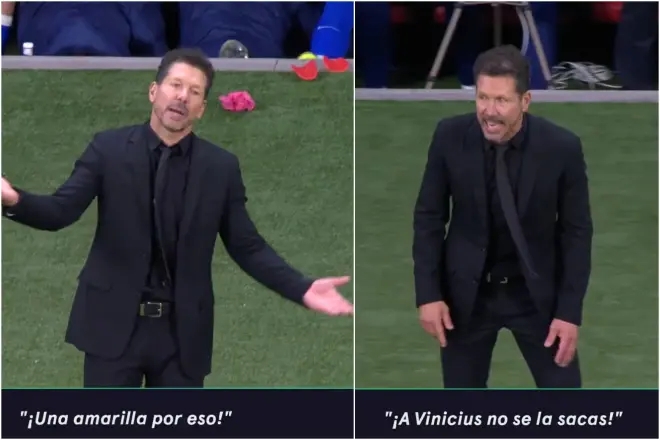 在一次违例 判决 之后,镜头拍到了马竞主帅西蒙尼正在对主裁曼萨诺抗议:“嘿!你在吹什么!冷静点!就为了这个出牌?”西蒙尼最后又摇着头说:“你不敢对维尼修斯出牌。”然后他又盯着第四官员重复了一遍这句话。