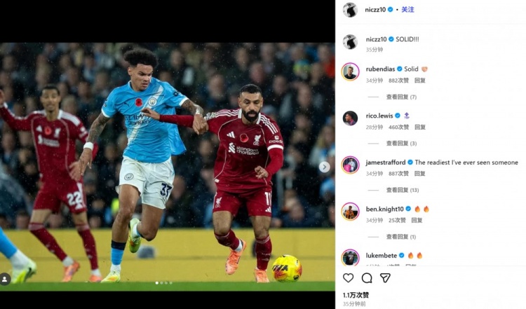 奥赖利也通过社媒晒出自己对位萨拉赫的赛事 照,并配文“硬!”表达自己的兴奋之情。