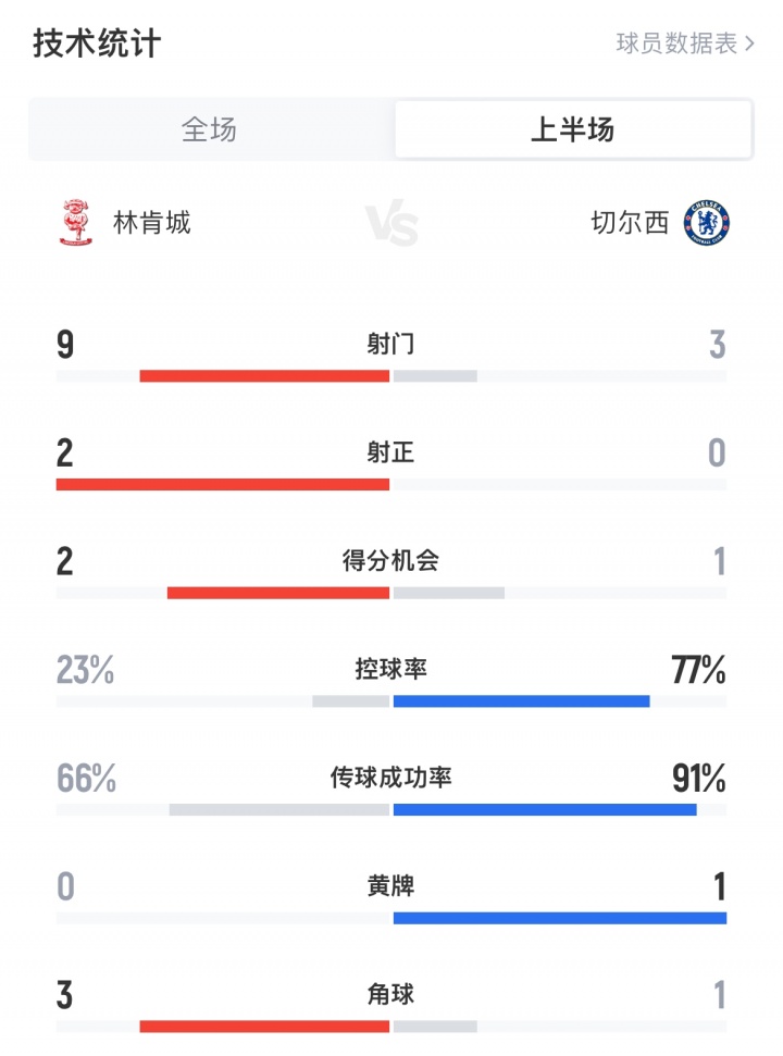 09月24日讯 职业联赛 杯切尔西客战英甲队林肯城半场结束,林肯城9脚打门,英超免费在线高清直播切尔西仅3脚,林肯城目前1-0领跑 切尔西。