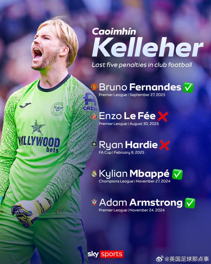 【扑点高手】Opta:凯莱赫效力于利物浦和布伦特福德期间,共面对7次十二码球(不包括罚球决胜 ),英超比赛在线观看无插件其中扑出4次(57 %)。