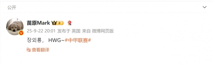 09月22日讯 媒体人苗原今日在社媒写道:장외룡, HWG~,并带上了中甲职业联赛 标签。