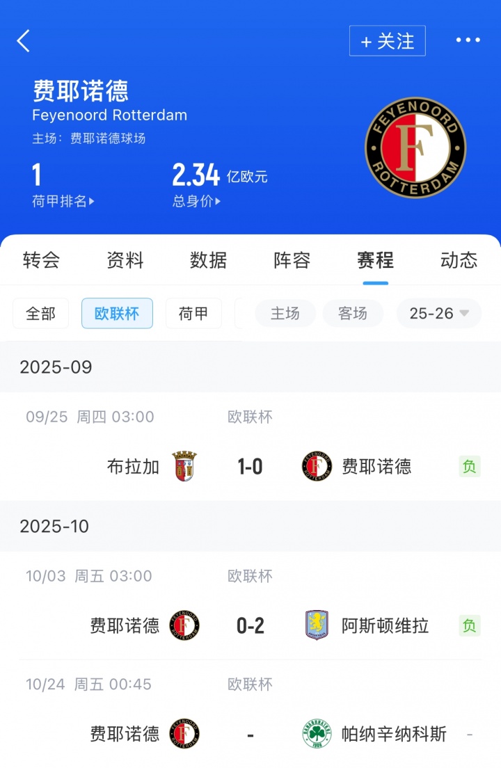 而在欧职业联赛 场,英超免费在线高清直播费耶诺德遭遇了两连败,0-1输给葡超布拉加,0-2不敌阿斯顿维拉。欧战开局2场0得分 ,也是费耶诺德队史最差记录 。