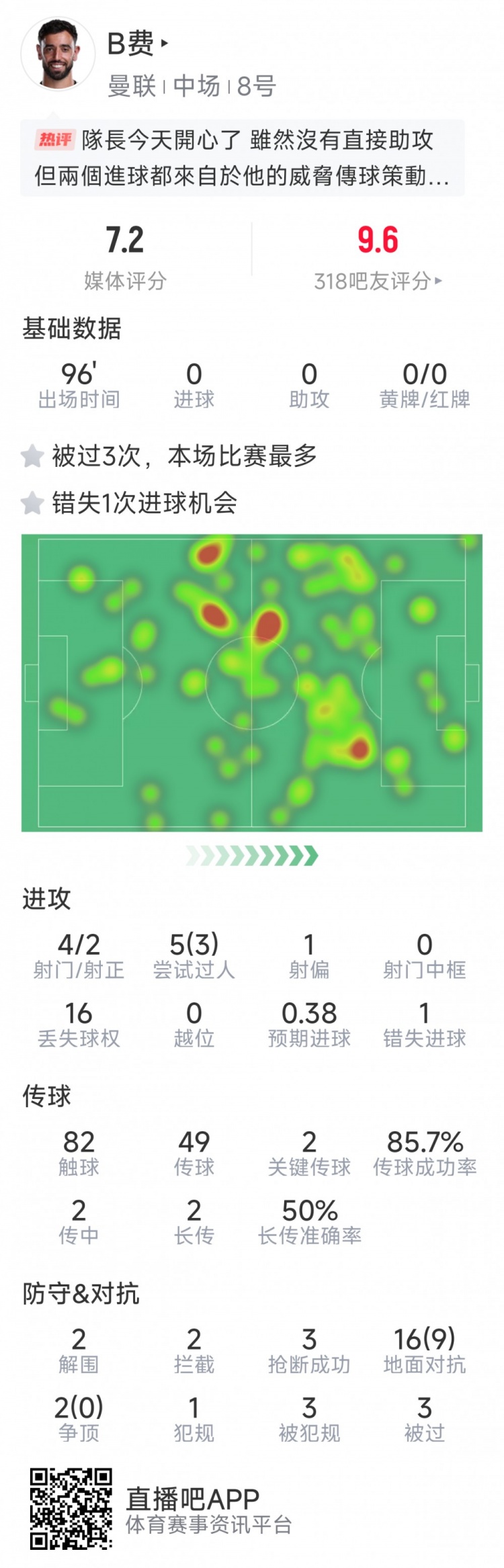 10月26日讯 在本轮英超,曼联4-2击败布莱顿,24直播网以下为B费本场数据: