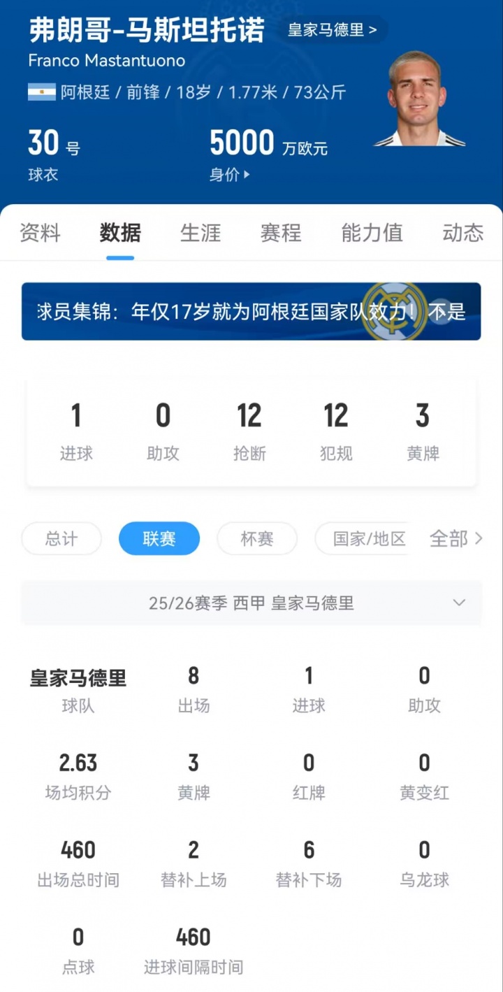 今夏皇马以4500万欧元签下18岁的马斯坦托诺,他至今已经为皇马在职业联赛 出场8次,贡献1个得分 ,目前的身价为5000万欧元。