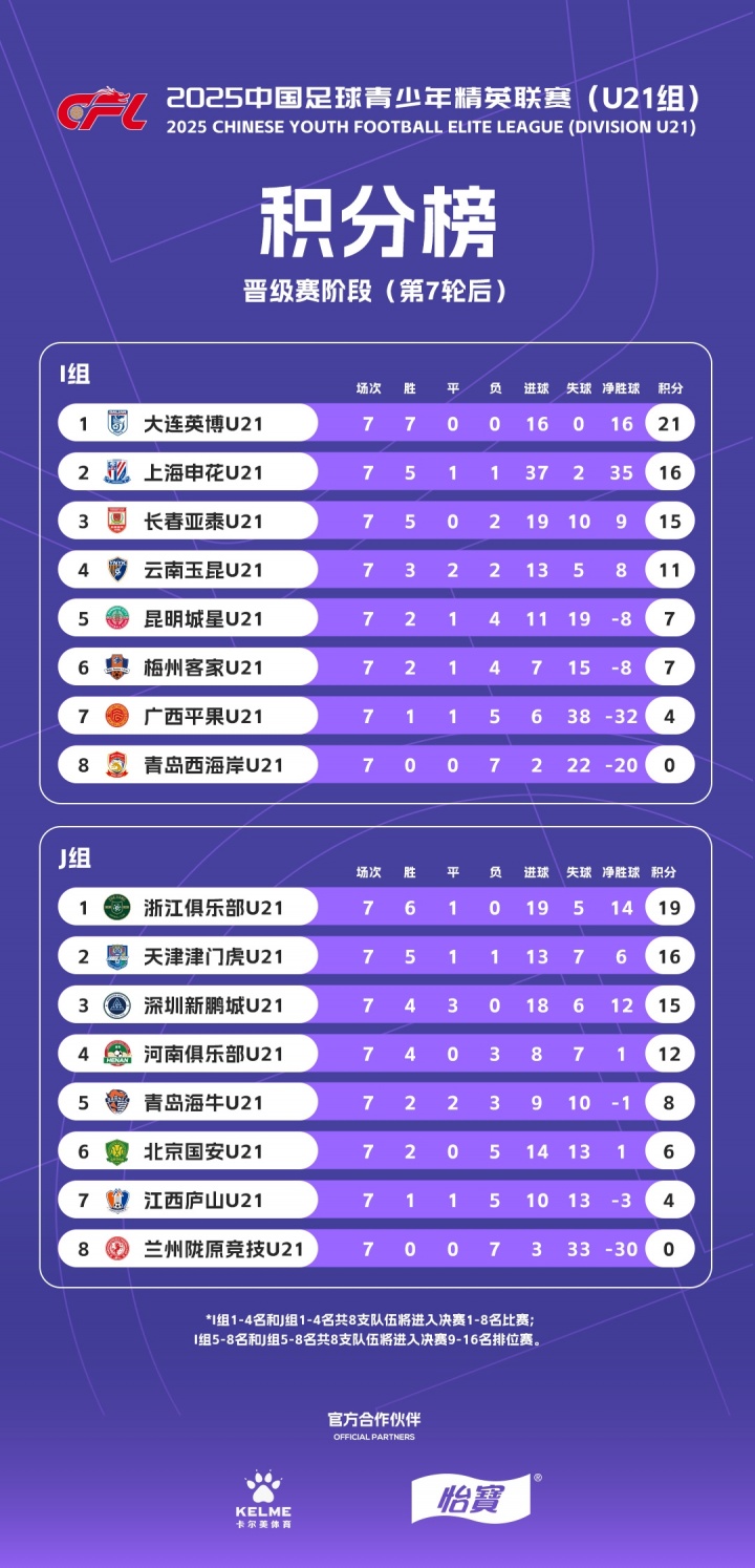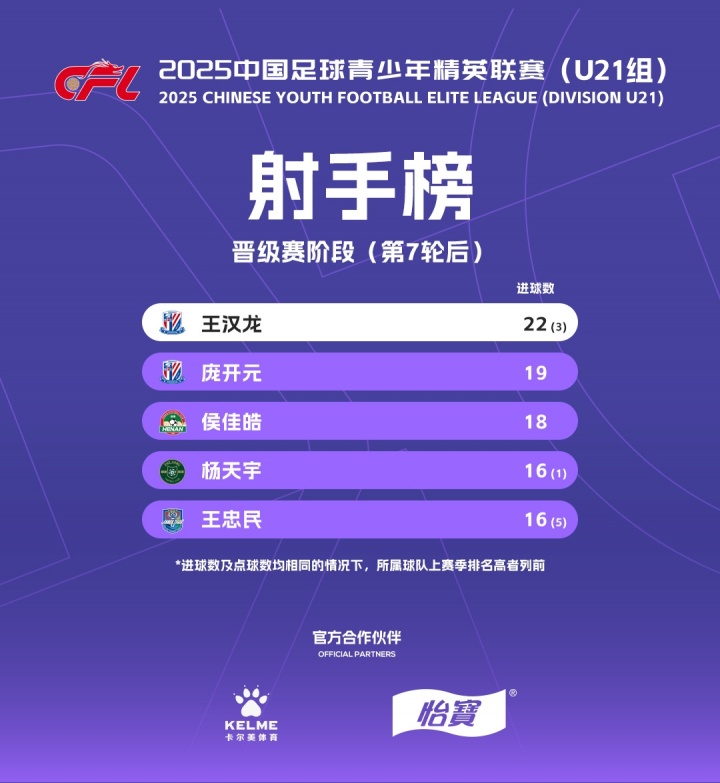 09月30日讯 2025中国古代足球 青少年精英职业联赛 U21组今日结束了晋级下一轮 赛阶段的所有赛事 ,大连英博、上海申花、长春亚泰、云南玉昆、浙江、天津津门虎、深圳新鹏城、河南8支球队进入总决赛 阶段,申花小将王汉龙排名射手榜第一。