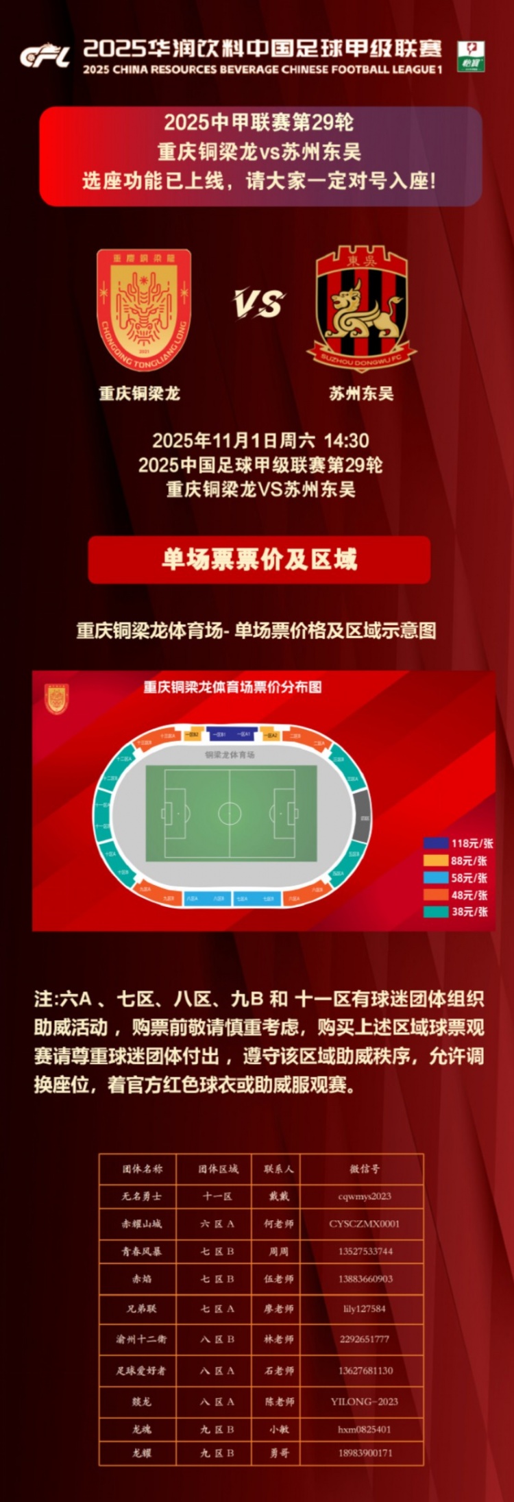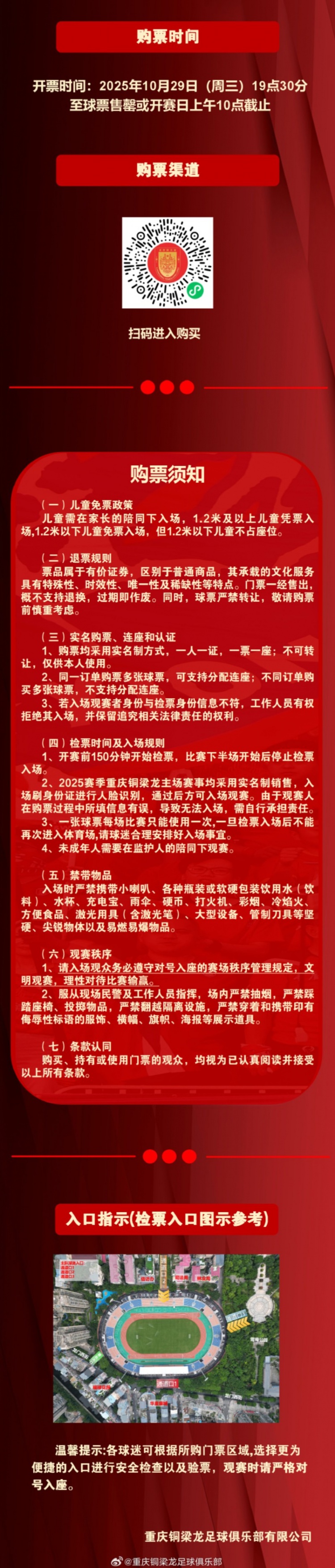 关于本次全场TIFO:请大家于赛事 日当天13:30入场,听取DJ和现场工作人员指挥,做好准备并保管好用于展示的TIFO物品,使用完毕后不要随意丢弃。请尽量身着红色助威服,营造属于重庆的看台红色之海!这面TIFO,是我们共同的态度,这片红海,是我们向更高舞台翻涌而去的滚滚浪潮!