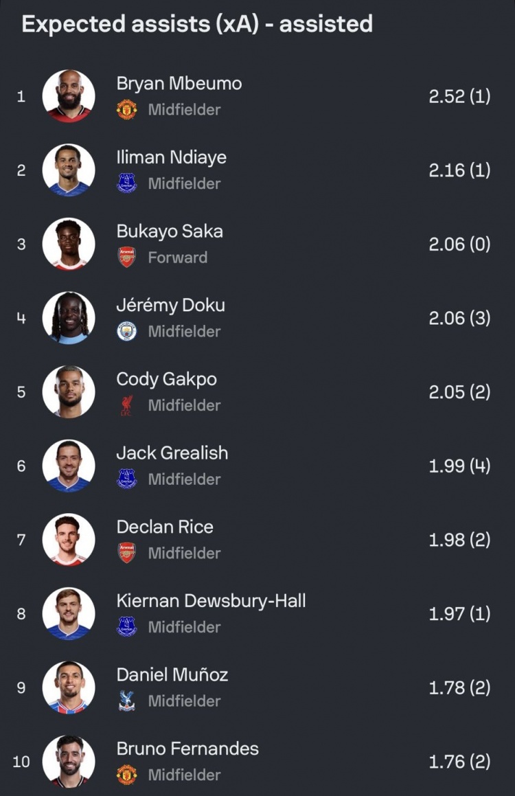 11月4日讯 媒体统计了本赛季球员在英超的预期助功 数据,并列出榜单,24直播网姆伯莫预期助功 2.52次居首,恩迪亚耶、萨卡二三位。