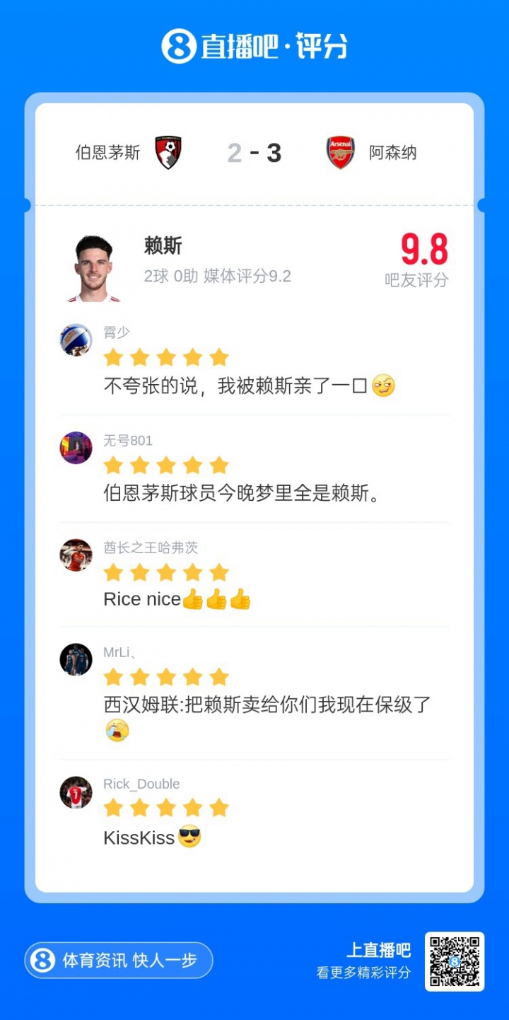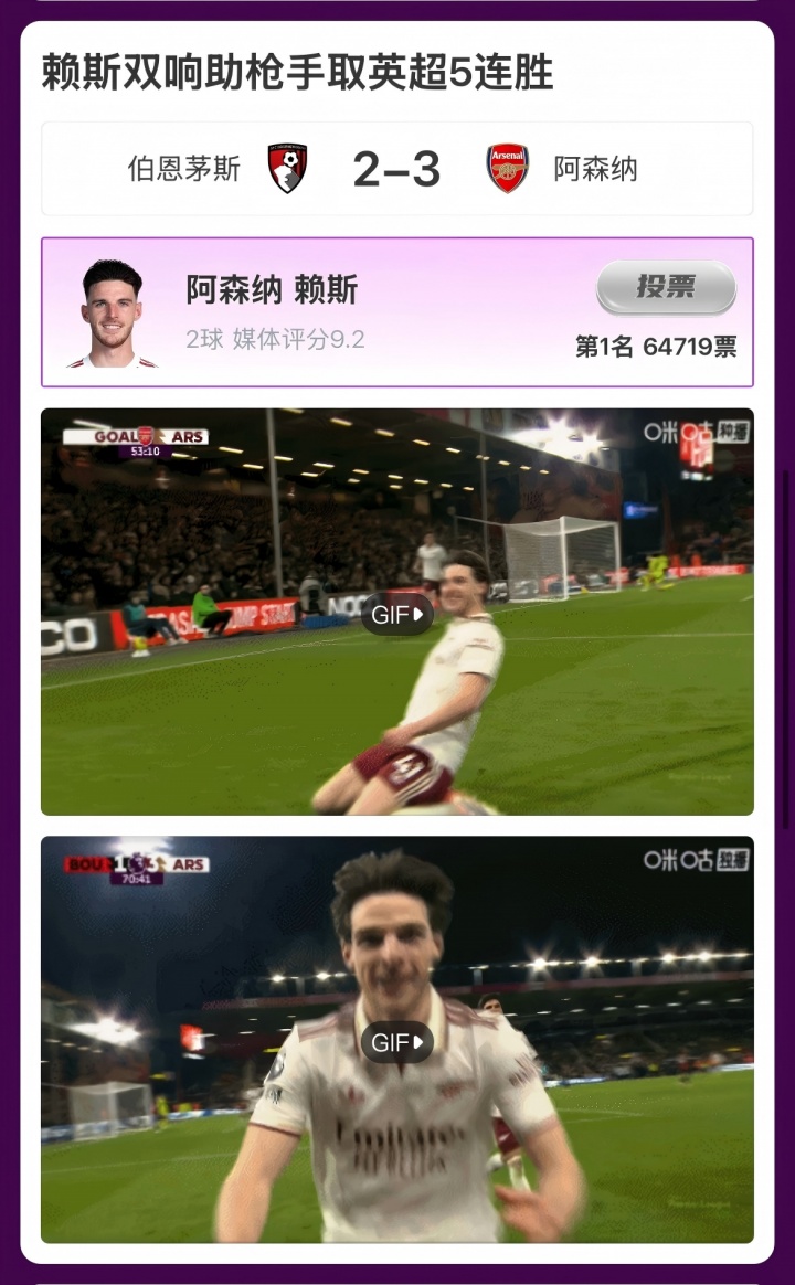 在阿森纳客战伯恩茅斯的赛事 中,赖斯不仅连进两球,24直播网还贡献1次关键传送球 ,还有3次解围、3次抄截 成功、6次地面对峙 3次成功,当选【X咪咕体育英超第20轮最佳球员】!