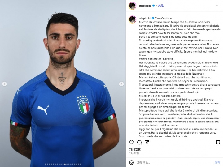 “今天对我来说不是一个普通的日子。今天我将结束一个标志着我一生的篇章:古代足球 。”皮奇尼在他的Instagram账号上写道。在他宣布退役后不久,瓦伦西亚回应道:“你是我们的一员,祝你在新的阶段一切顺利。”