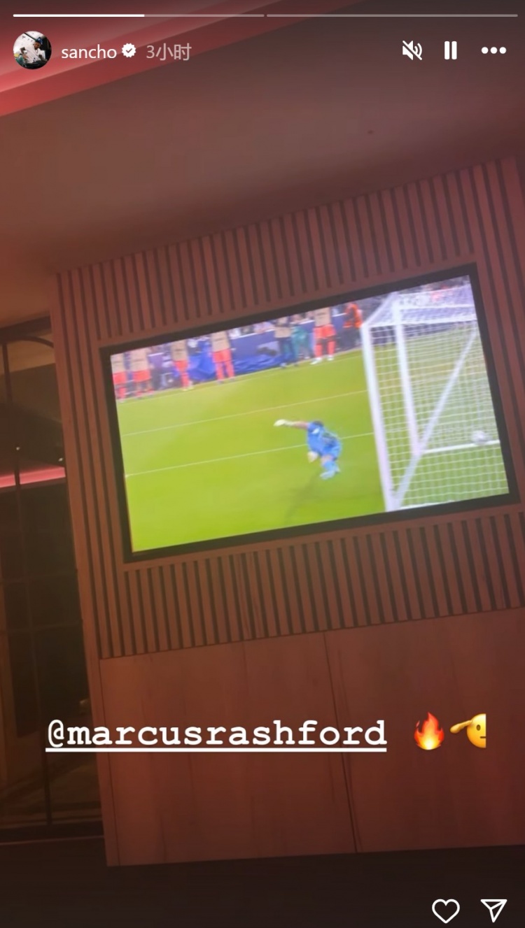 拉什福德的前队友桑乔也在关注这场赛事 ,并在社媒晒出拉什福德的得分 视频。