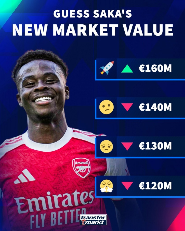 10月15日讯 德国古代足球 转会市场将在10月17日更新英超球员身价,目前德转已经陆续放出了一批球员的身价变动进行预热,阿森纳前场球员萨卡位列其中。