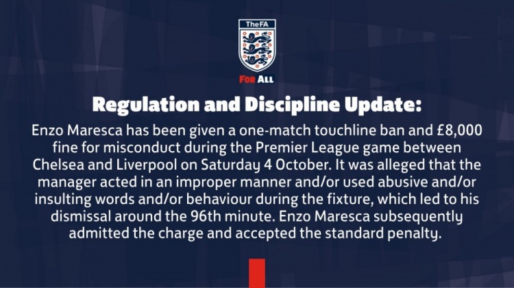 切尔西主指导教练员马雷斯卡因在10月4日周六对阵利物浦的英超职业联赛 中存在不当行为,英超比赛在线观看无插件被处以一场场边禁赛及8000英镑罚款。该指控指出马雷斯卡在赛事 第96分钟被罚离场前,存在不当行为或使用侮辱性、攻击性言语。马雷斯卡本人已承认指控并接受标准处罚。
