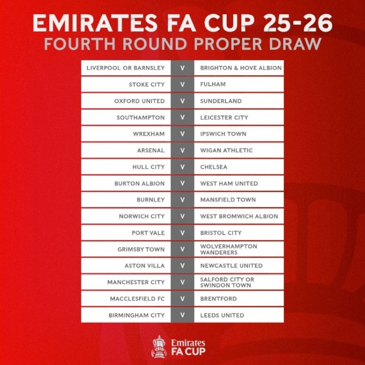 足总杯25/26赛季第四轮正式比赛对阵抽签: